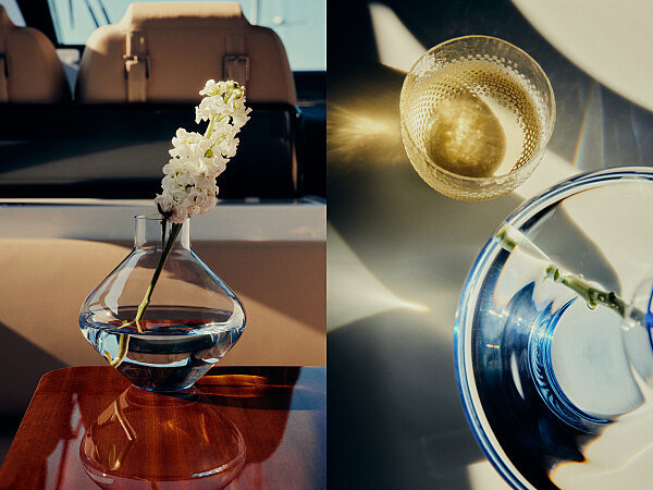 Mit an Bord der ikonischen "Riva Diable": ICHIGO.Coupette No. 1 Champagne, ICHIGO.Coupette No. 2 Cocktail sowie ICHIGO.Bloom No. 1 Vase & Decanter in den Farben Crystal, Citrine, Rosalin und Light Blue.
